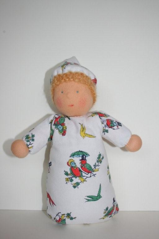 Knuffelpop Robin Robin is gemaakt van wit retro-flanel met vogeltjes en heeft een kort mutsje VERKOCHT |