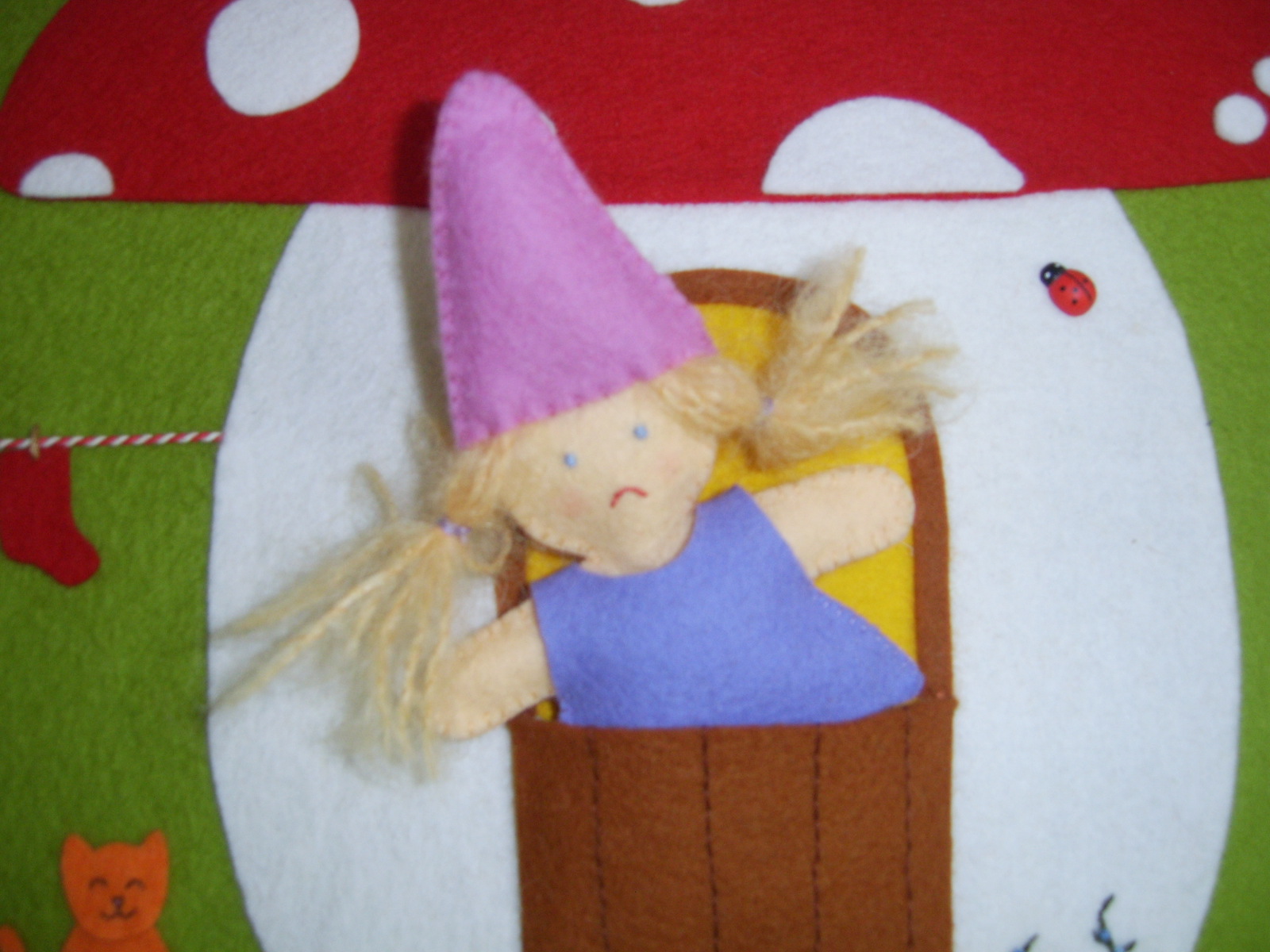 Viltschilderij paddestoel Dit vrolijke meisje kan uit haar paddestoel worden gehaald en als je haar omdraait, kijkt ze sip! (ook als jongetje te verkrijgen) Prijs: € 135,00 |